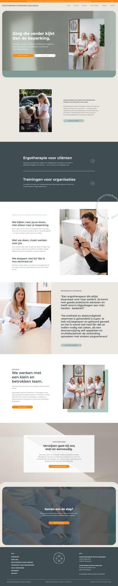 Hun wens? Meer modern, toegankelijk en met nét dat beetje warmte. We kozen voor zachte aardetinten, rustige typografie en veel persoonlijke beelden uit hun eigen praktijk. De website is opgebouwd met een duidelijke structuur, gericht op cliënten én verwijzers, en biedt ruimte voor groei (zoals trainingen en vacatures).